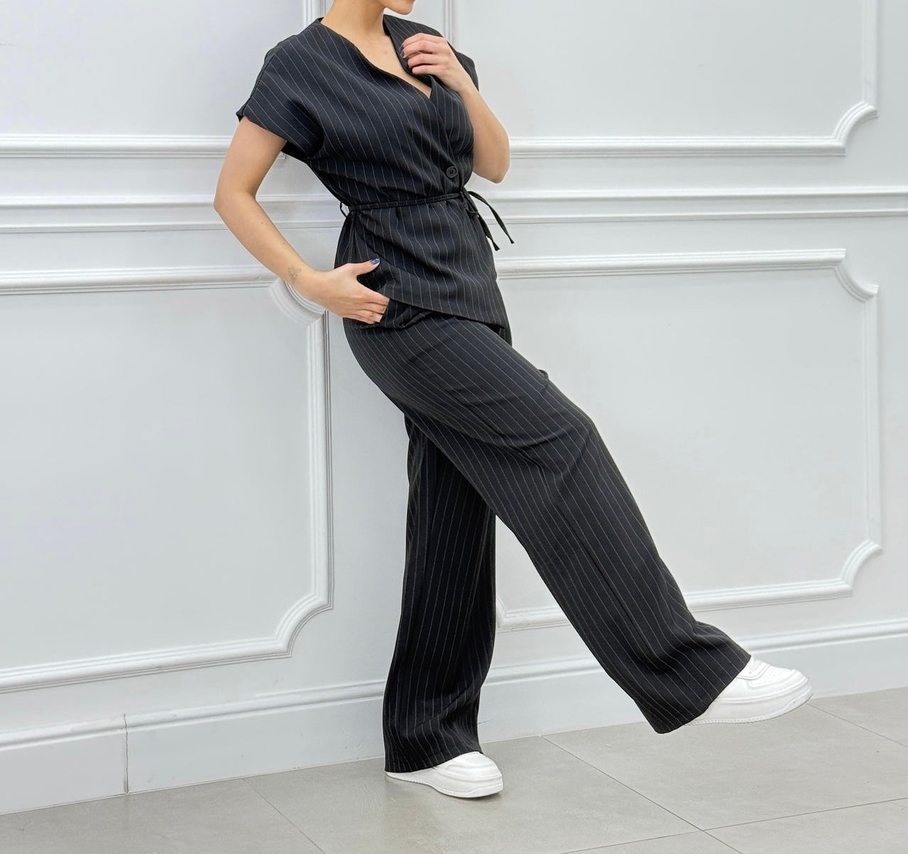 Completo rigato gilet e pantalone a palazzo