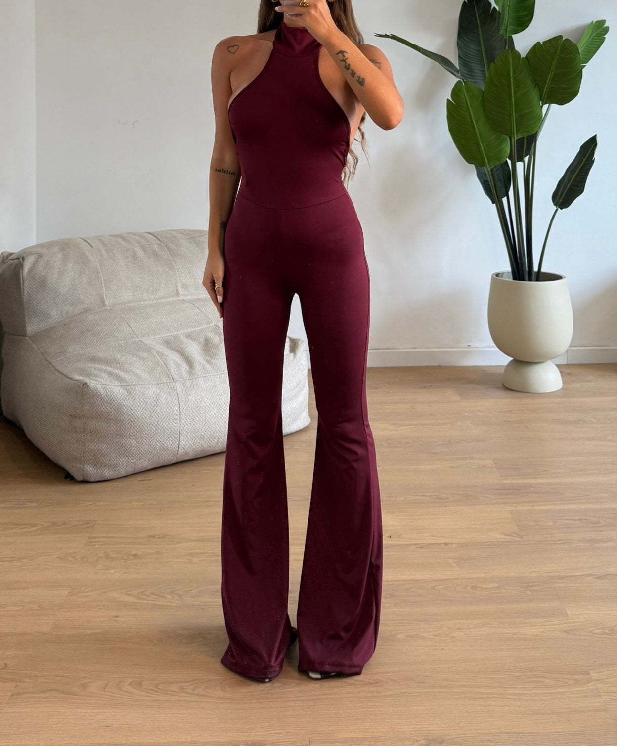 Tuta scollo all’americana pantalone a zampa schiena scoperta arricciata sul retro tessuto elasticizzato