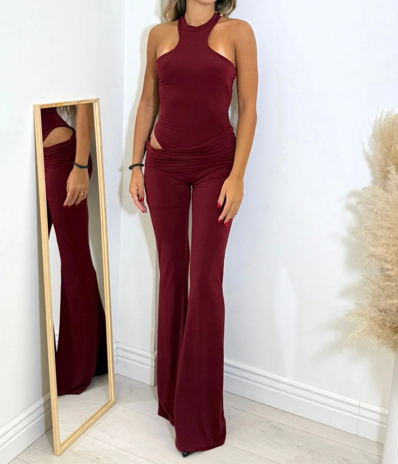 jumpusit aderente in tessuto elasticizzato con ampi cut-out e pantalone a zampa.